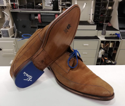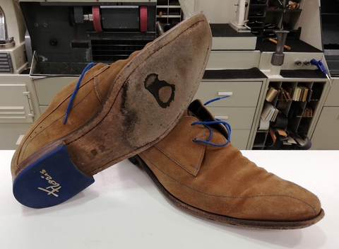 Een paar Floris van Bommel voorzien van nieuwe originele hakken en JR leren zolen.