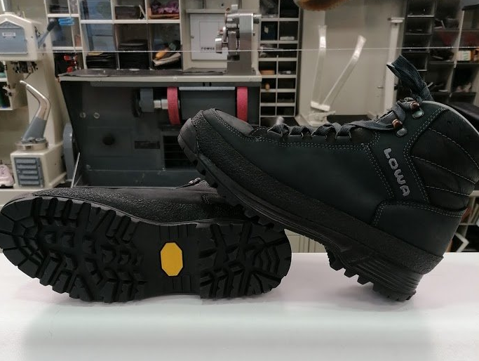Wandelschoenen van het merk Lowa voorzien van een compleet nieuw Vibram onderwerk en een nieuwe rand.